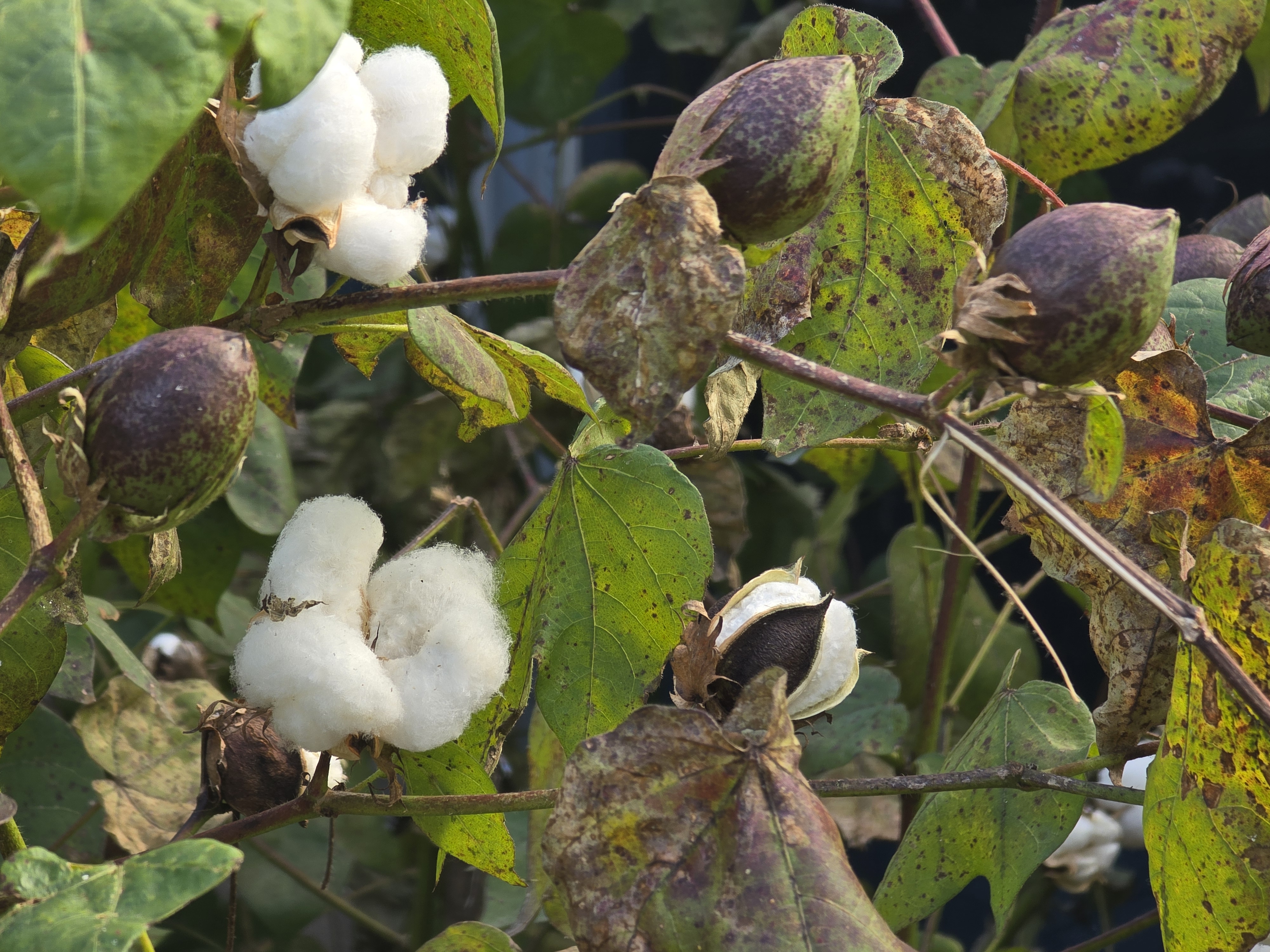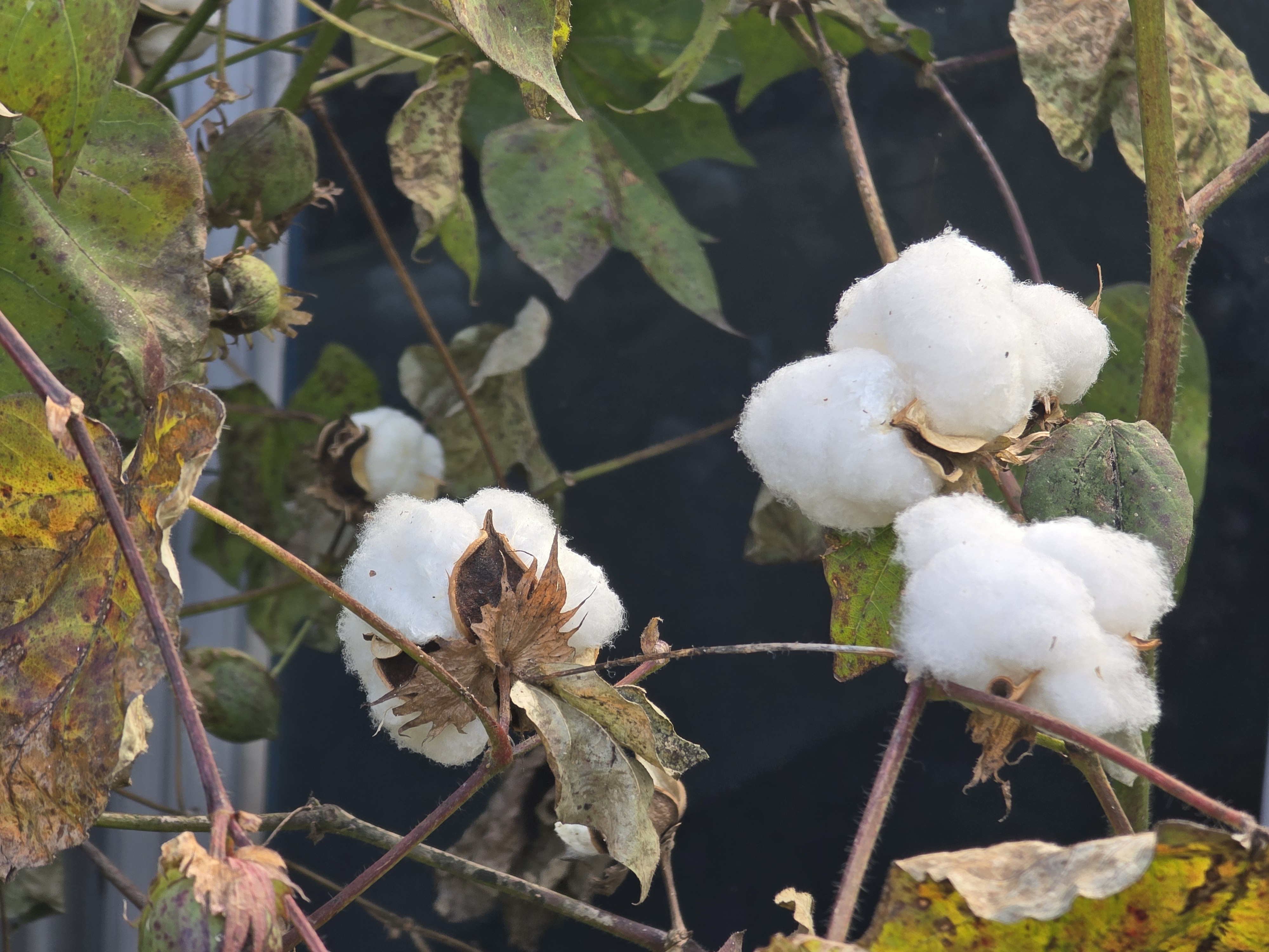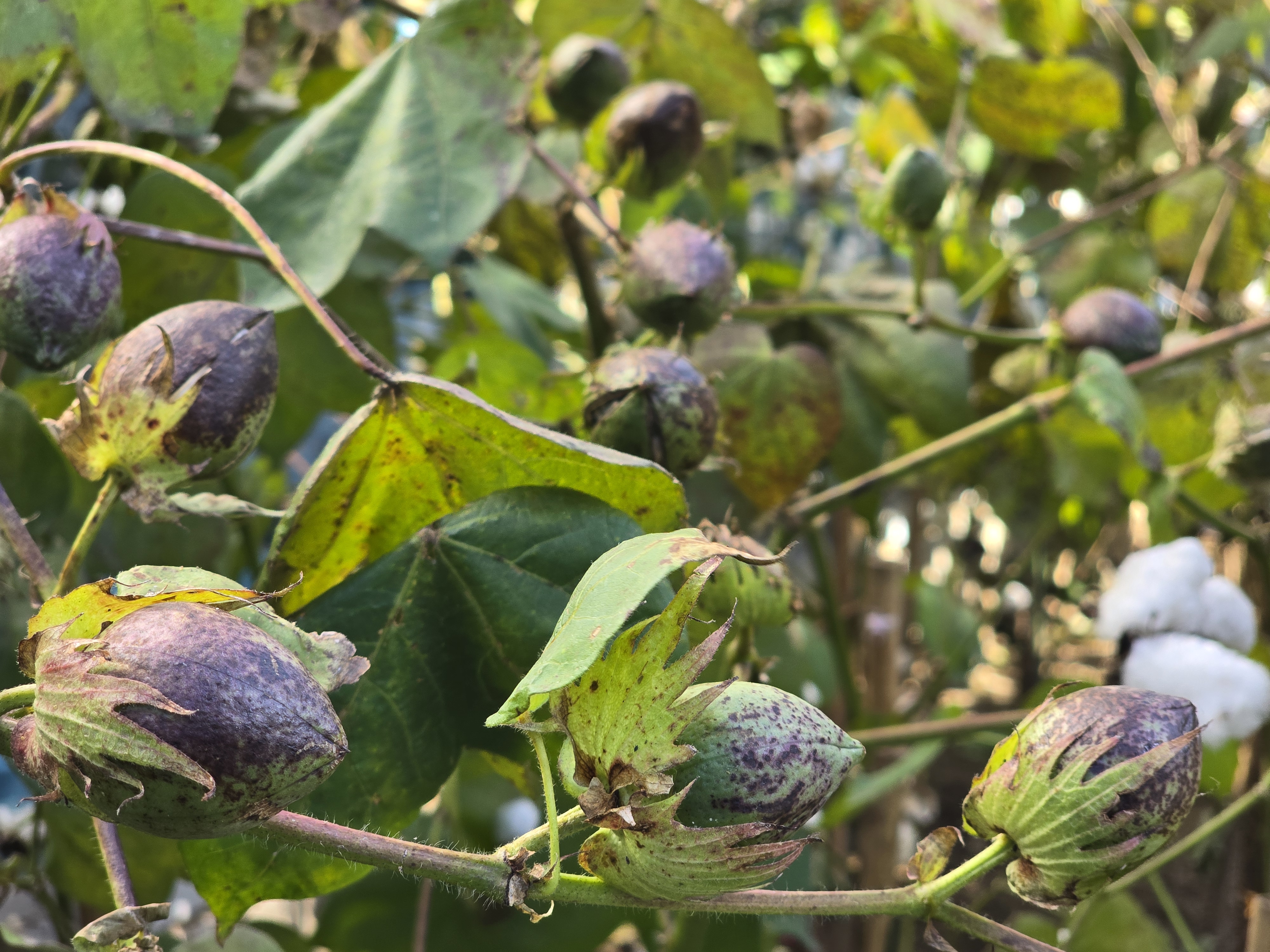 삭과로 목화다래 라고부르며 익으면3~4갈래로 갈라지며 씨를덮고있는 솜털(섬유)가 나옵니다./ 이윤수. 2025.11.10. 폰찍음.