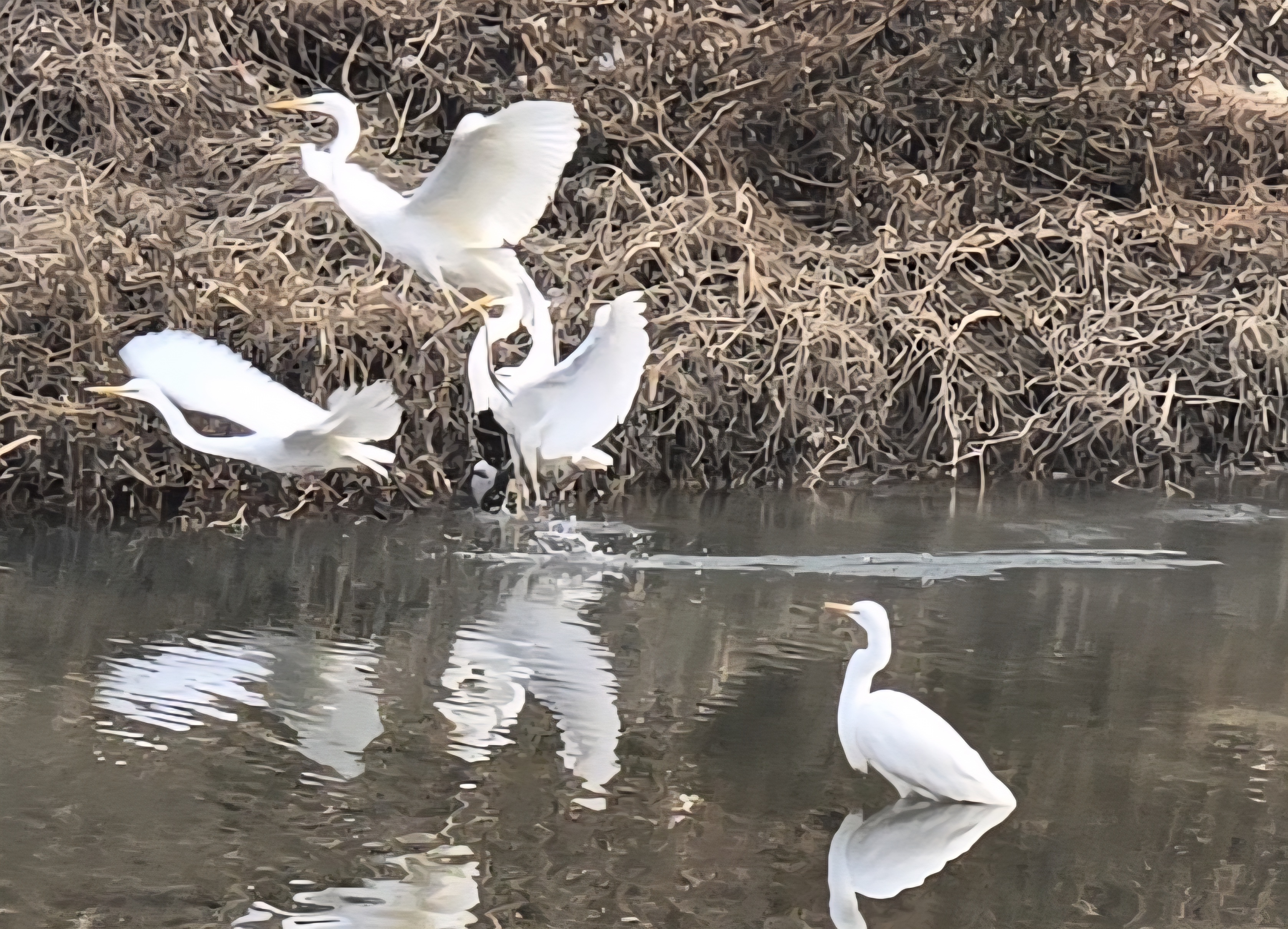 한겨울의 고요한 개천가에 추위와 겨울바람을 이겨내고 백로들이 우아한 자태로 내려앉는모습의